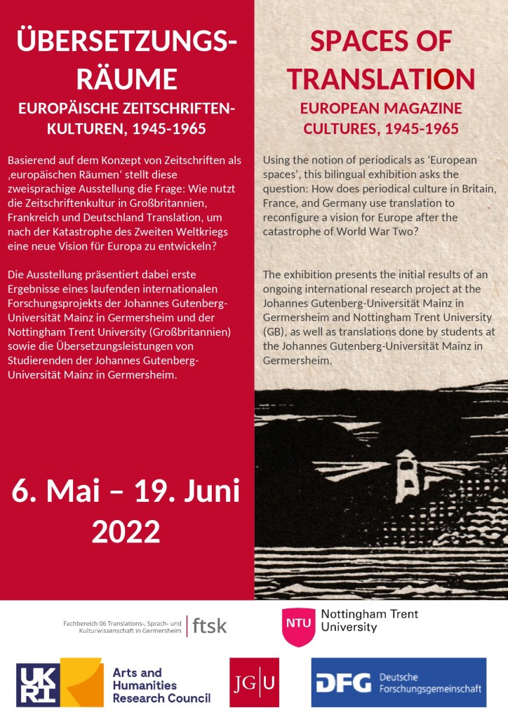 As part of our research project as well as a teaching project at the English Department of the Johannes Gutenberg Universität-Mainz/Germersheim, a bilingual Anglo-German exhibition will open its doors in Germersheim next week. Our exhibition uses literary and cultural magazines from Britain, France and Germany to consider how, through translation, notions of European identity were constructed in the period following from the end of World War Two to the mid-1960s.