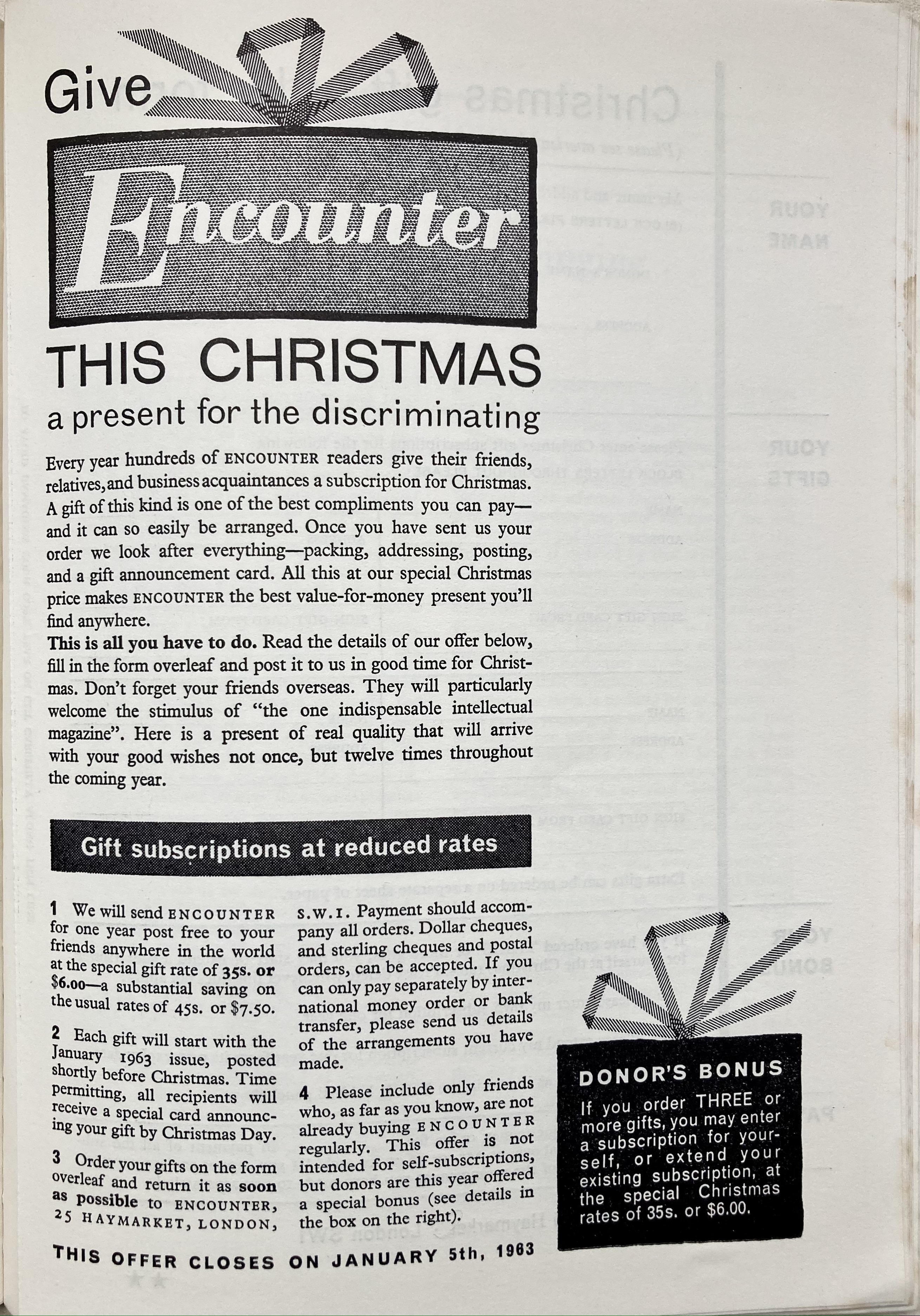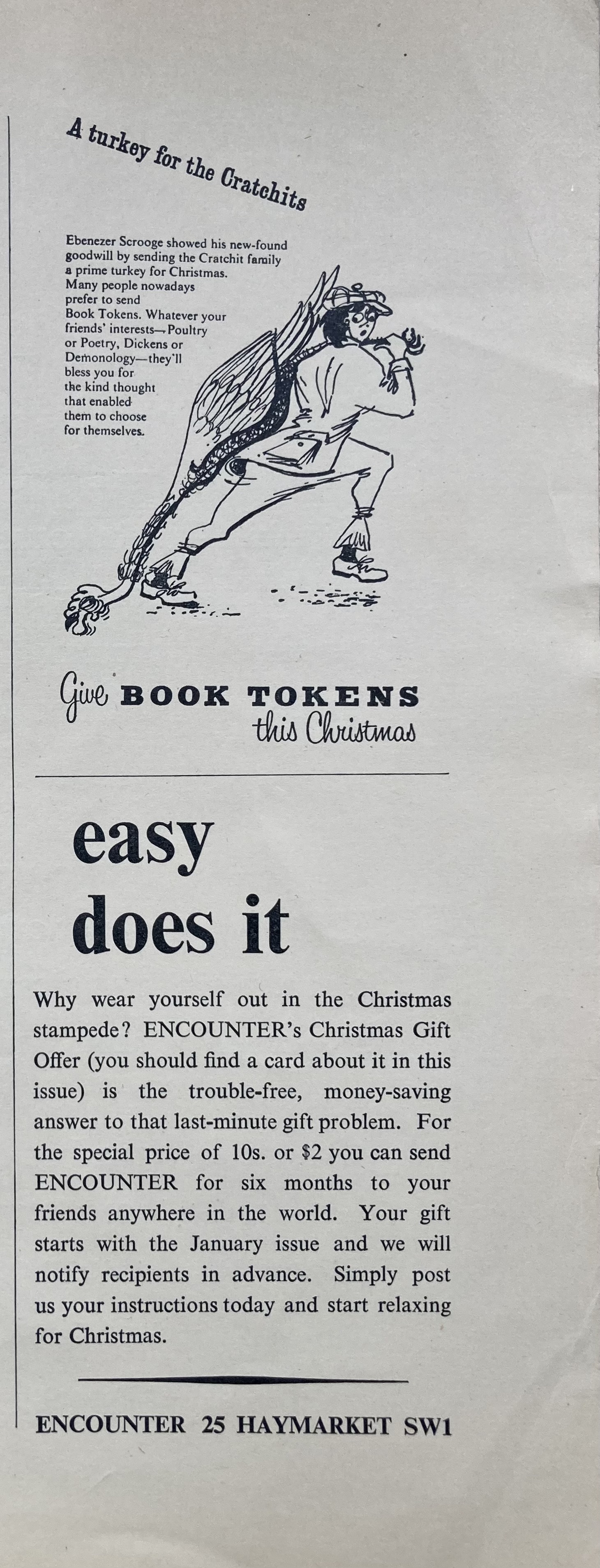 First of, the English magazine Encounter uses the time of gift giving to remind its readers in these ads from 1962 and 1956 that the magazine itself might be the best gift their friends and family could ask for: