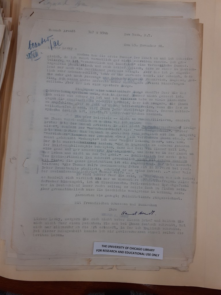 Without any of her own material being published in it, Arendt wrote a lengthy critique of the translation done in the very first issue of Der Monat: “An immediate concern for you,” she told co-editor-in-chief Melvin Lasky, “should be the translation problem, which is not solved in this issue. […] it doesn’t work this way; or rather, if you let it go on like this, any boy whose native language is German will be able to give you serious competition.”