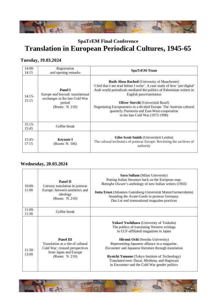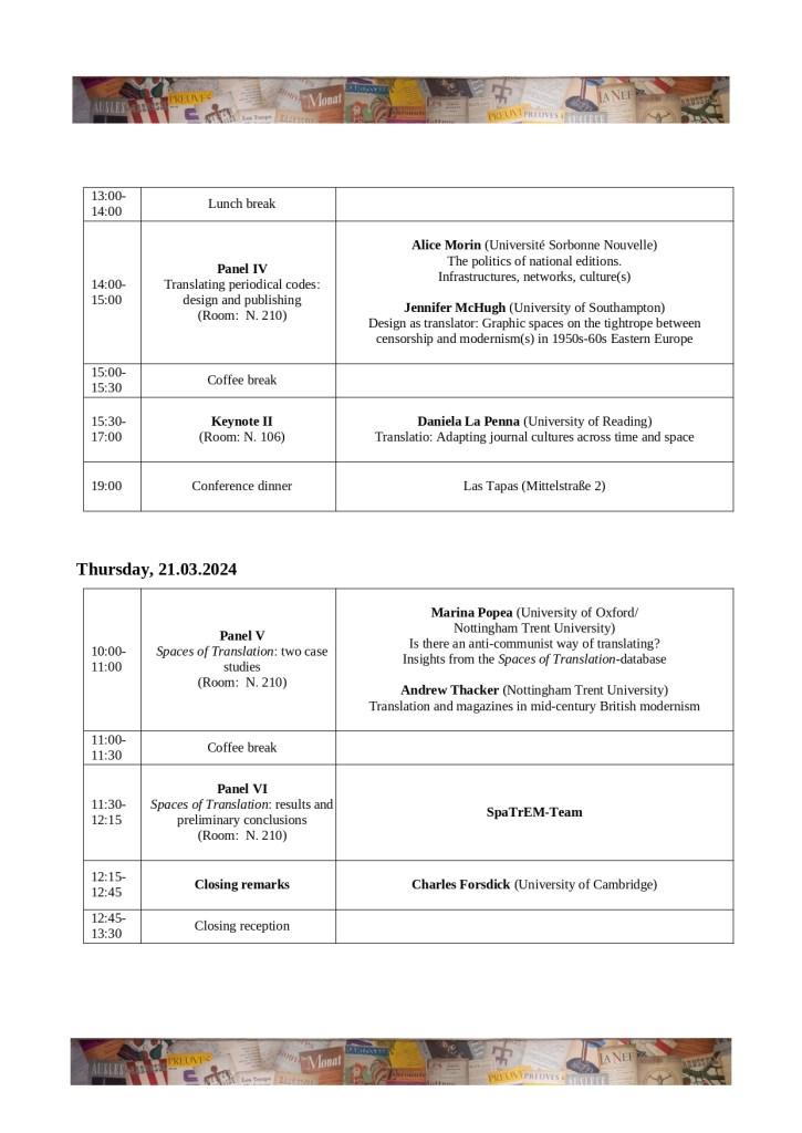 To conclude the Spaces of Translation: European Magazine Culture, 1945-65 project (SpaTrEM) we will hold an international conference in March 2024 at the Germersheim campus of Johannes Gutenberg University, Mainz.